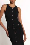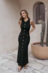 Slip into effortless sophistication with the Aspen Button Up Knit Dress in Black. This maxi-length design offers comfort and style in perfect harmony. featuring a flattering round neckline and gleaming gold buttons that add a touch of elegance to any look.