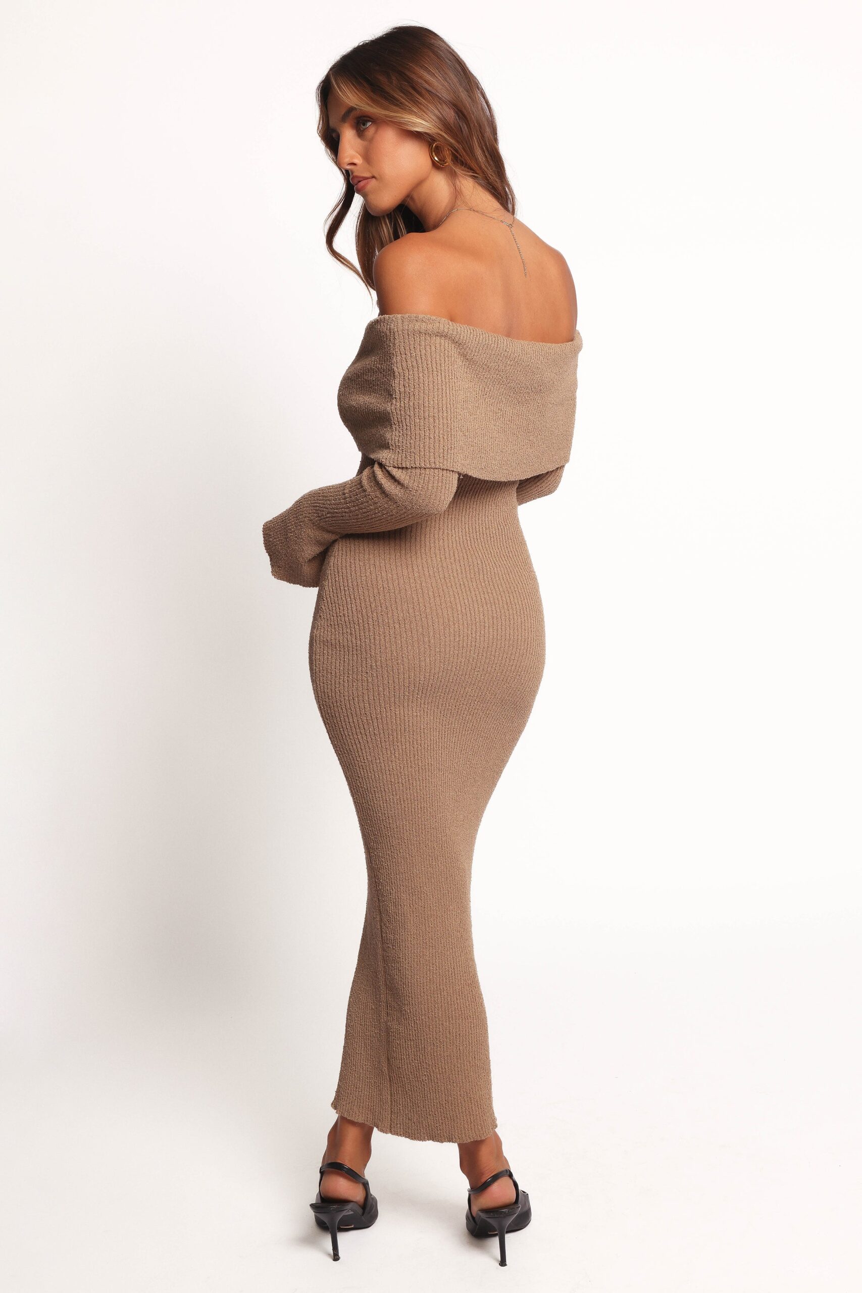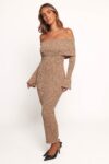 Turn heads effortlessly in the Domitia Off Shoulder Knit Dress in Brown. This stunning midi dress combines timeless elegance with a modern twist. featuring a fold-over straight neckline that enhances your collarbone and creates a flattering silhouette.